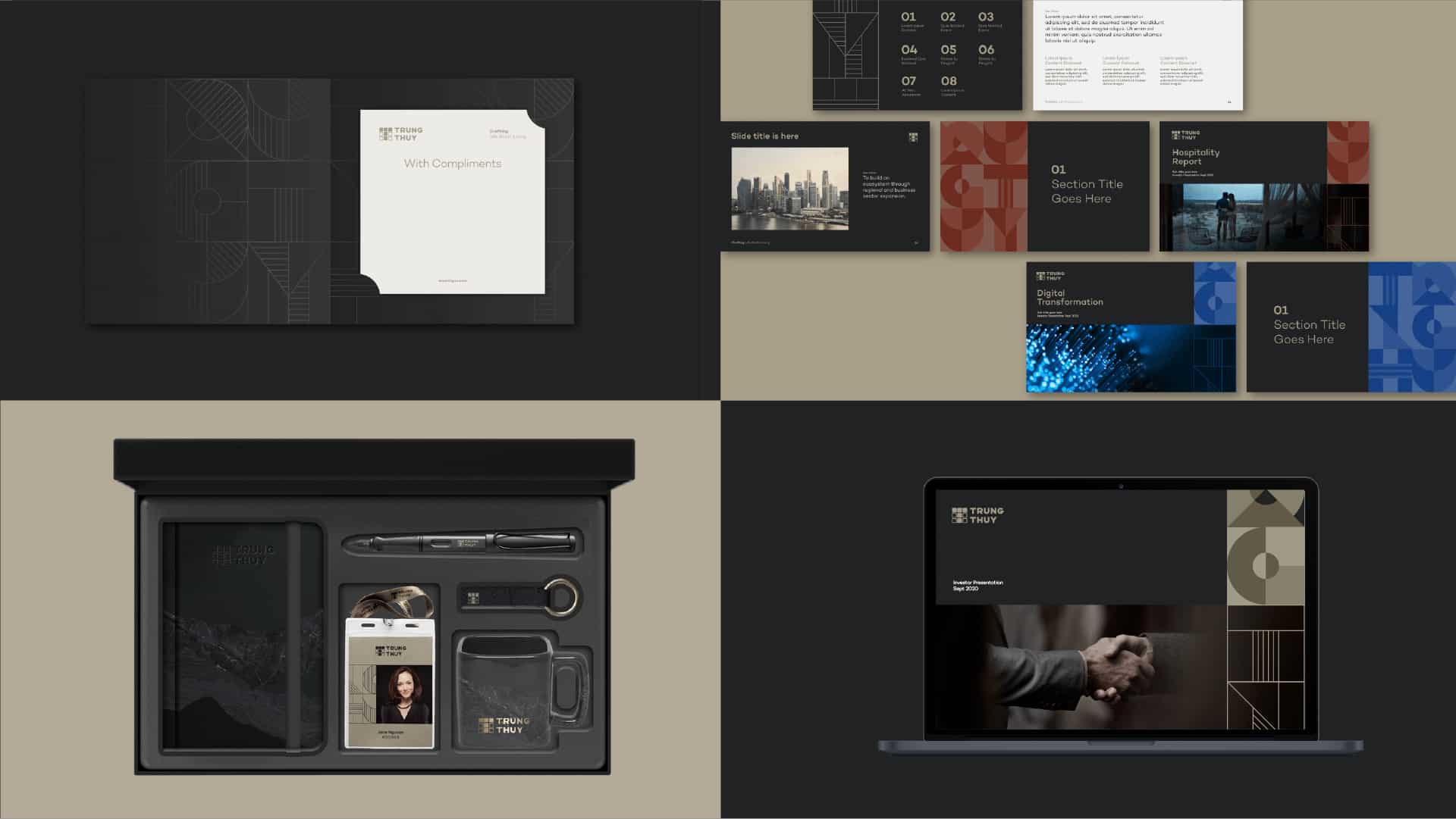 The symbol of nine squares is kept and enhanced further into a brand graphic design system that evokes a sense of uniqueness and premiumness of the Trung Thuy brand with each device representing a letter of the corporate name. Along with various colors from the palette, the graphic device system brings a high level of flexibility in usage.
